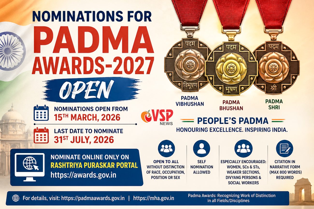 Posted in NATIONALपद्म पुरस्कार 2027 के लिए नामांकन शुरू, अंतिम तिथि 31 जुलाई 2026। ऑनलाइन आवेदन प्रक्रिया, पात्रता और जरूरी जानकारी यहां जानेंby VSP News•0